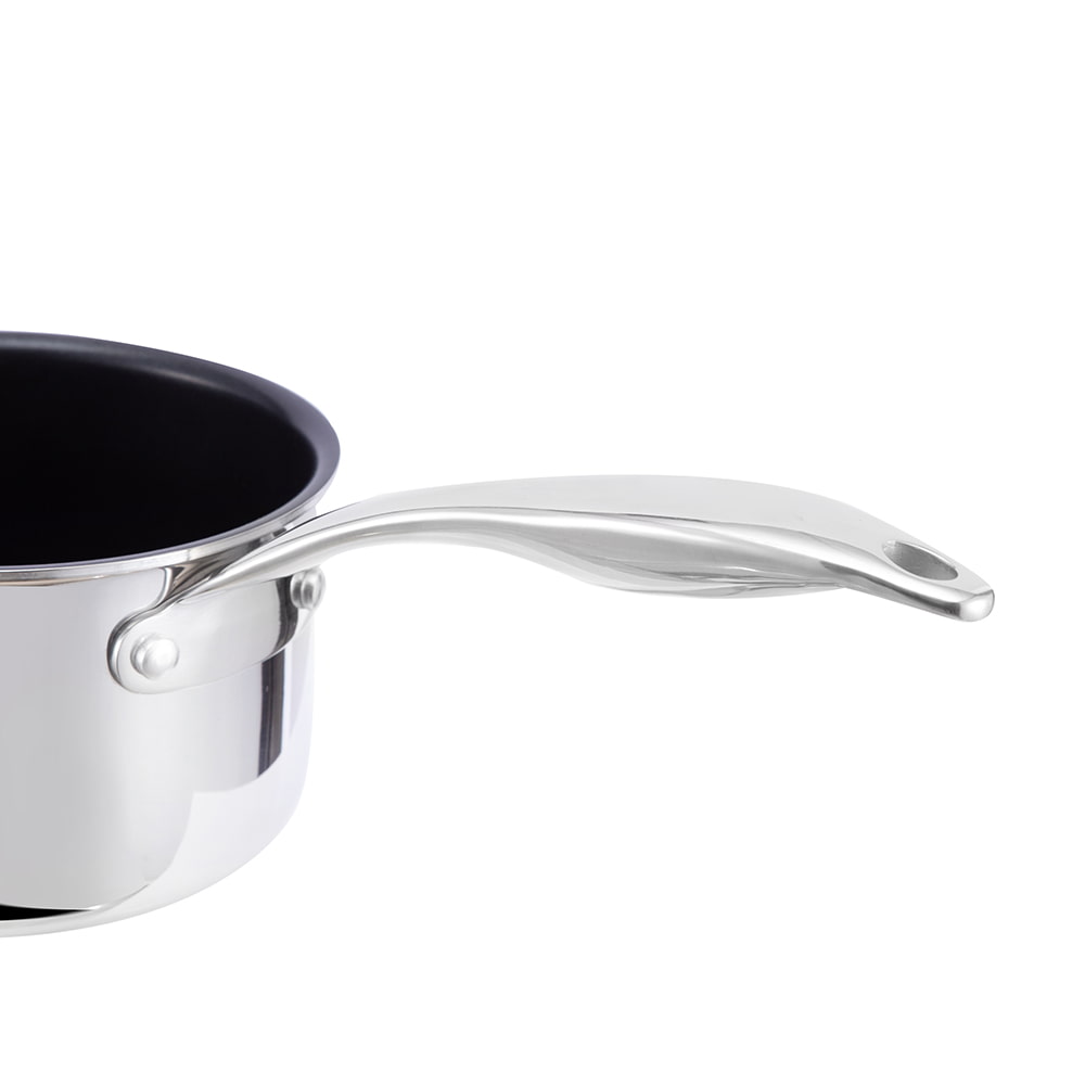 Rozsdamentes acélból készült, modern háromrétegű alaptechnológiával (rozsdamentes alumínium rozsdamentes acél), amely egyenletesen osztja el a hőt, gyorsabb főzést biztosít, és hosszabb ideig melegen tartja az ételt. 14 cm átmérőjű, kiváló méret a különféle konyhai feladatokhoz.